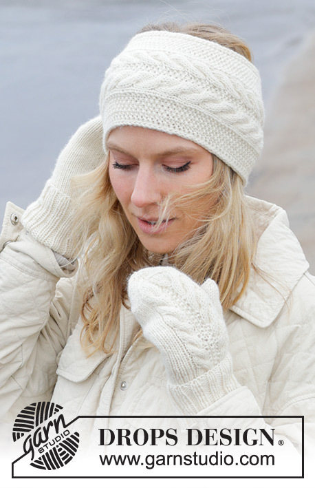 Knitted head band in DROPS Merino Extra Fine. The piece is worked back and forth, sideways with moss stitch and cables.