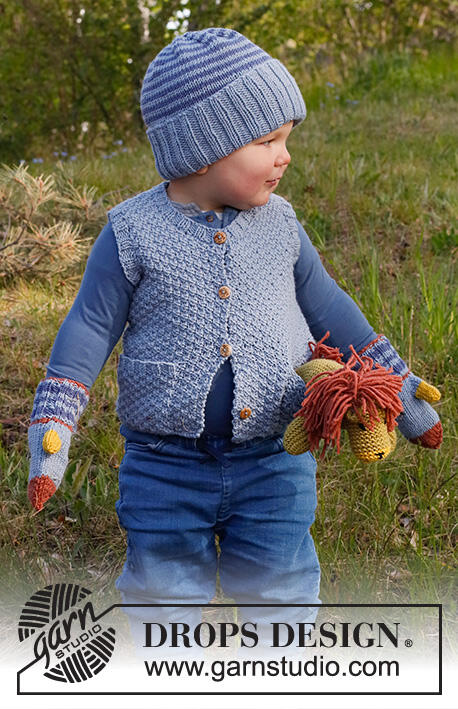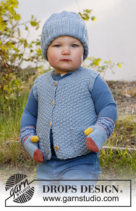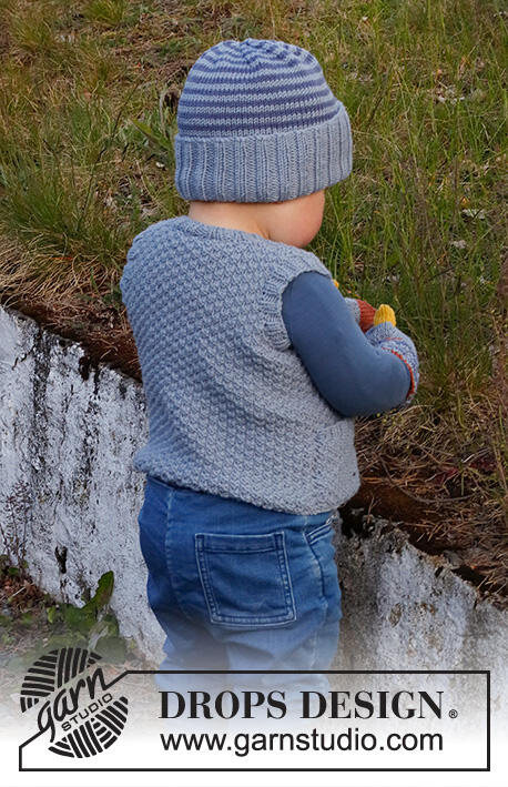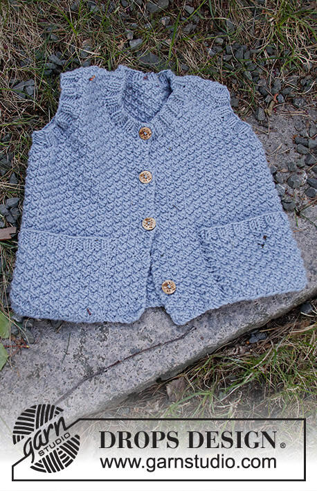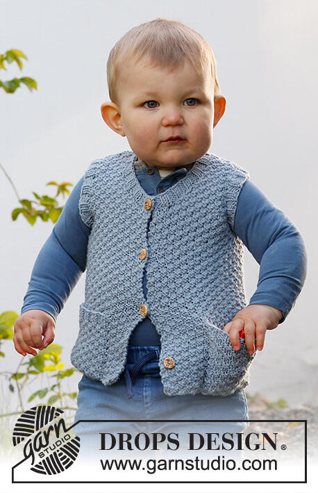 Knitted vest for baby and kids in DROPS Merino Extra Fine. Piece is knitted with V- neck and double moss stitch. Size 6 month - 8 years