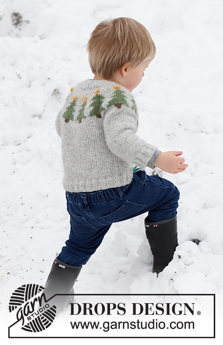 Knitted Christmas jumper for children in DROPS Air. The jumper is worked top down with round yoke and Christmas tree pattern. Sizes 2 - 14 years. Theme: Christmas.