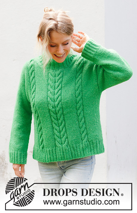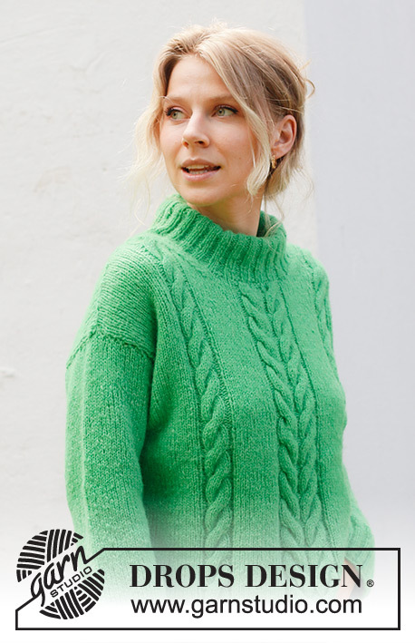 Knitted sweater in DROPS Air. The piece is worked bottom up with cables, diagonal shoulders and double neck. Sizes S - XXXL.