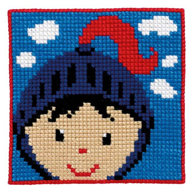The kit contains a signed motif, fabric, yarn and a needle that is not pointed.