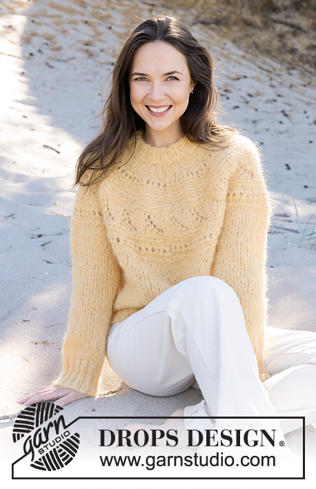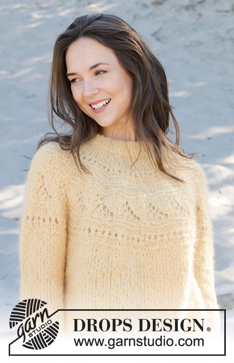Knitted sweater in DROPS Melody. The piece is worked top down with double neck and patterned, round yoke. Sizes XS - XXL.