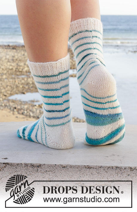 Knitted socks in DROPS Fabel Print and DROPS Fabel Uni Colour. The piece is worked at an angle and with stripes, from the toe upwards. Sizes 35 – 43.
