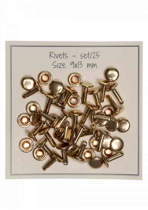 25 pcs. ornaments for decorating your next bag project. The rivets are very easy to mount and give the bag a personal touch. They have a size of 9 x 13 mm and are available in gold.