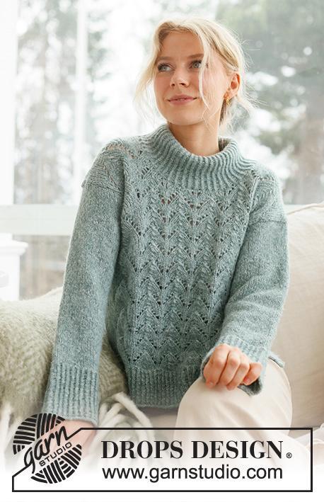 Knitted jumper in DROPS Air. The piece is worked bottom up, with lace pattern, split in the sides and high neck. Sizes S - XXXL.