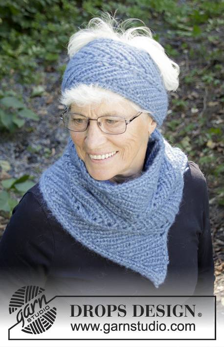 Knitted headband in 2 threads DROPS Air. The work is knitted sideways in staggered rib. Knitted neckline in 2 threads DROPS Air. The work is knitted sideways in staggered rib.