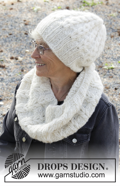 Knitted hat in DROPS Air and DROPS Brushed Alpaca Silk. The work is knitted around with structure. Knitted neckline in DROPS Air and DROPS Brushed Alpaca Silk. The work is knitted around with structure.