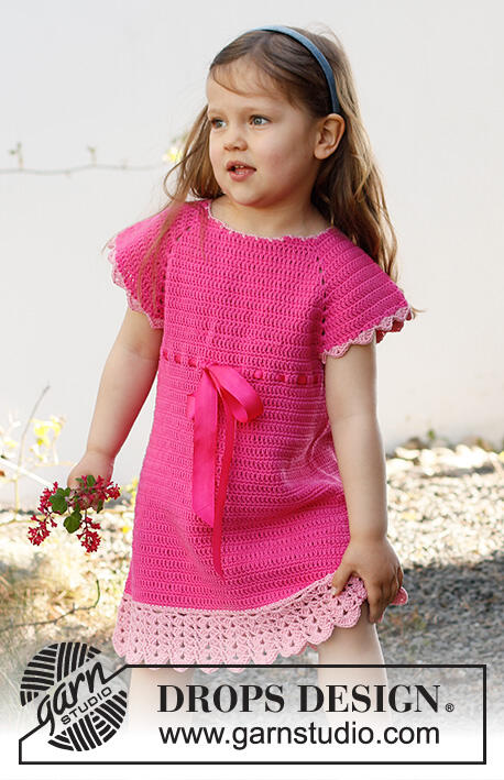 Crochet dress for babies and children in DROPS Safran. The piece is worked top down, with raglan and lace pattern. Sizes 0 months – 6 years.