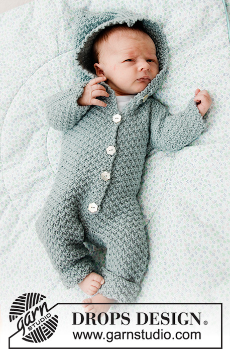 Knitted baby costume in DROPS Merino Extra Fine. The work is knitted with textured pattern and hood. Size premature - 4 years.