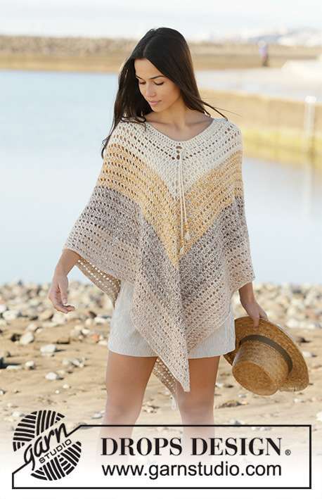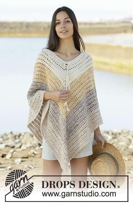 Crochet poncho with stripes in DROPS Alpaca. Piece is crocheted top down with 2 strands Alpaca. Size: S - XXXL
