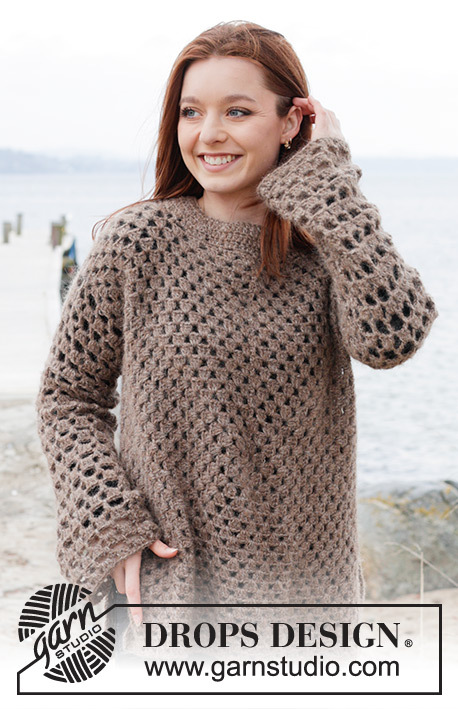 Crocheted sweater in DROPS Brushed Alpaca Silk and DROPS Flora. The piece is worked from the middle outwards, in squares. Sizes S - XXXL.